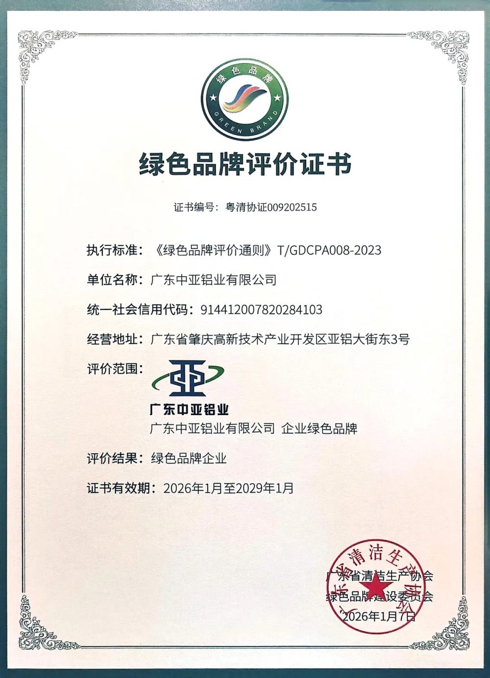 喜訊!中亞鋁業榮獲企業綠色品牌!